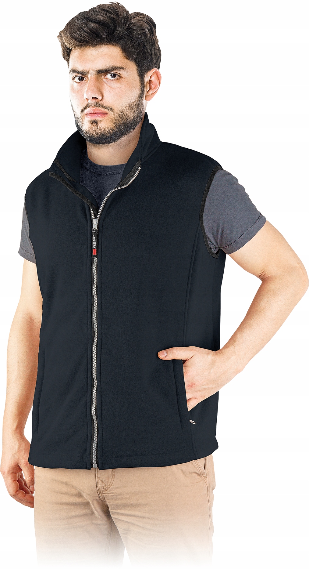 Model posiada zamek błyskawiczny na całej długości, co pozwala szybko go założyć lub zdjąć. Kołnierz w formie stójki skutecznie chroni szyję przed wiatrem i chłodem. Po bokach umieszczono dwie kieszenie zapinane na suwak, które umożliwiają bezpieczne przechowywanie drobiazgów. Krój bez rękawów zapewnia pełną swobodę ruchów, dzięki czemu bezrękawnik doskonale sprawdza się podczas pracy fizycznej lub aktywności na świeżym powietrzu.